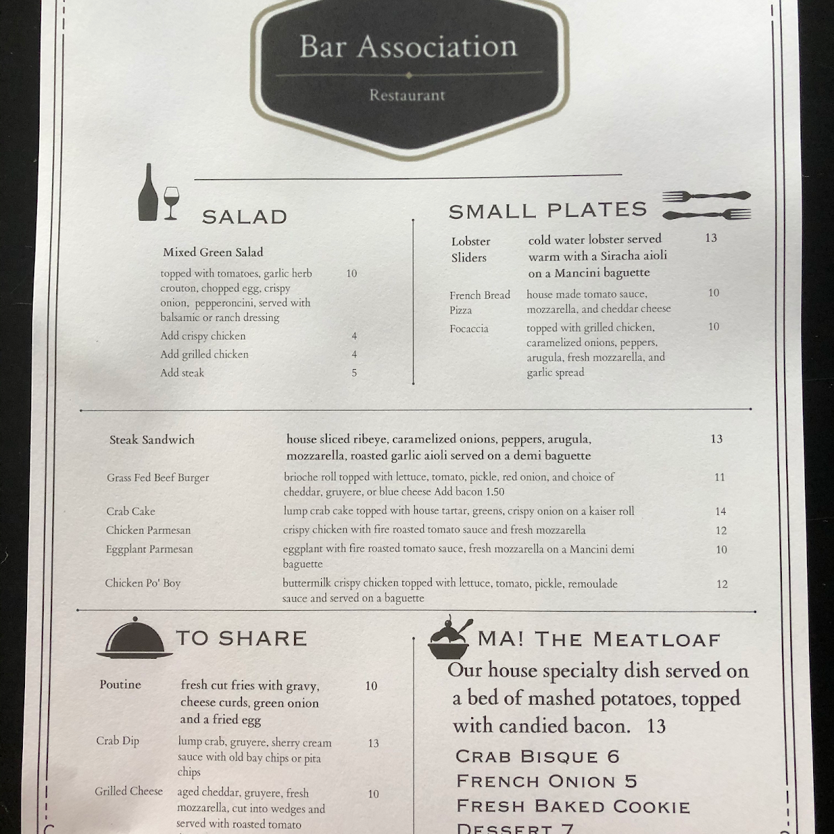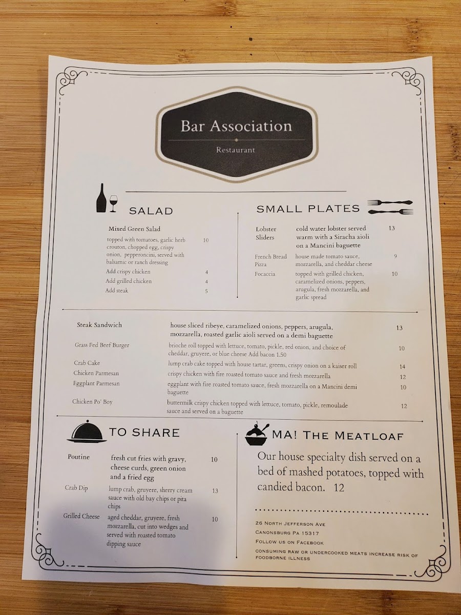 Introducing the menu at Bar Association Restaurant, a casual gastro pub in Canonsburg, PA, reveals a delightful array of American fare and an impressive martini selection. The extensive martini menu has quickly become a standout feature, with creatively crafted options like the Tiramisu Martini and Orange Creamsicle Martini garnering rave reviews.